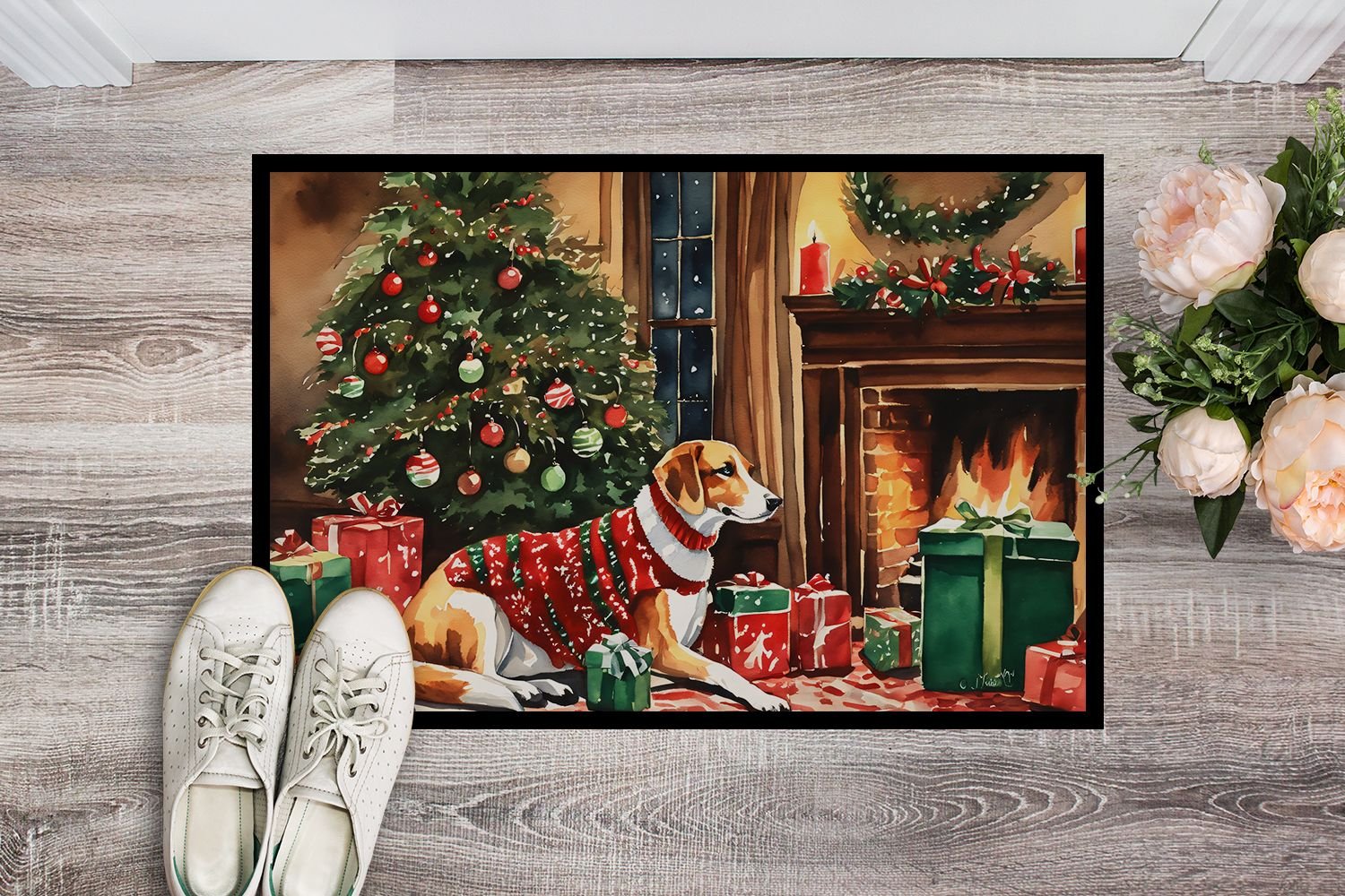 Doormat featuring breed specific American Foxhound artwork. Celebrate Christmas with this Christmas Doormat. Welcome your guests in style with our Artwork Door Mat, designed to withstand almost any weather condition. This mat, measuring approximately 24 by 36 inches, is held together by durable black binding tape. Its top layer, composed of polyester felt, is dyed with the eye-catching image you see on the mat. A few layers below provide the mat with stability, while its rubber bottom is stamped to help prevent slipping and ensures safety. Our mat works wonderfully as both an indoor or outdoor door mat. For cleaning, simply hose it off with water or use a power washer - no need for any cleaner that produces suds. Avoid scrubbing with a brush, instead, opt for the vacuum on floor setting. Designed manufactured and printed in the USA, this mat is a perfect addition to your porch, outdoor kitchen, entryway, or any indoor space. Its unique design makes it a charming decorative rug that greets your guests and adds a stylish touch to your home decor.