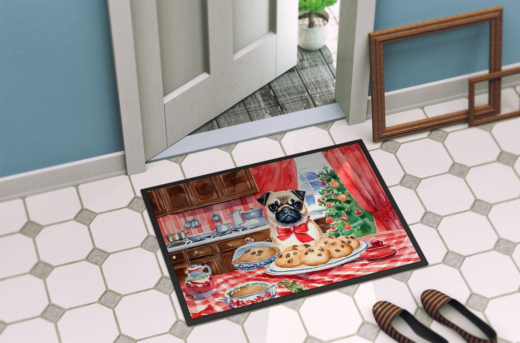 Doormat featuring breed specific Pug artwork. Celebrate Christmas with this Christmas Doormat. Welcome your guests in style with our Artwork Door Mat, designed to withstand almost any weather condition. This mat, measuring approximately 24 by 36 inches, is held together by durable black binding tape. Its top layer, composed of polyester felt, is dyed with the eye-catching image you see on the mat. A few layers below provide the mat with stability, while its rubber bottom is stamped to help prevent slipping and ensures safety. Our mat works wonderfully as both an indoor or outdoor door mat. For cleaning, simply hose it off with water or use a power washer - no need for any cleaner that produces suds. Avoid scrubbing with a brush, instead, opt for the vacuum on floor setting. Designed manufactured and printed in the USA, this mat is a perfect addition to your porch, outdoor kitchen, entryway, or any indoor space. Its unique design makes it a charming decorative rug that greets your guests and adds a stylish touch to your home decor.