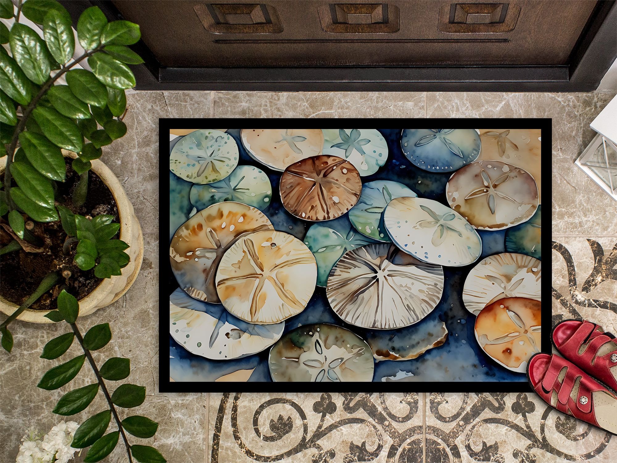Doormat featuring breed specific Sand Dollars artwork. Welcome your guests in style with our Artwork Door Mat, designed to withstand almost any weather condition. This mat, measuring approximately 24 by 36 inches, is held together by durable black binding tape. Its top layer, composed of polyester felt, is dyed with the eye-catching image you see on the mat. A few layers below provide the mat with stability, while its rubber bottom is stamped to help prevent slipping and ensures safety. Our mat works wonderfully as both an indoor or outdoor door mat. For cleaning, simply hose it off with water or use a power washer - no need for any cleaner that produces suds. Avoid scrubbing with a brush, instead, opt for the vacuum on floor setting. Designed manufactured and printed in the USA, this mat is a perfect addition to your porch, outdoor kitchen, entryway, or any indoor space. Its unique design makes it a charming decorative rug that greets your guests and adds a stylish touch to your home decor.