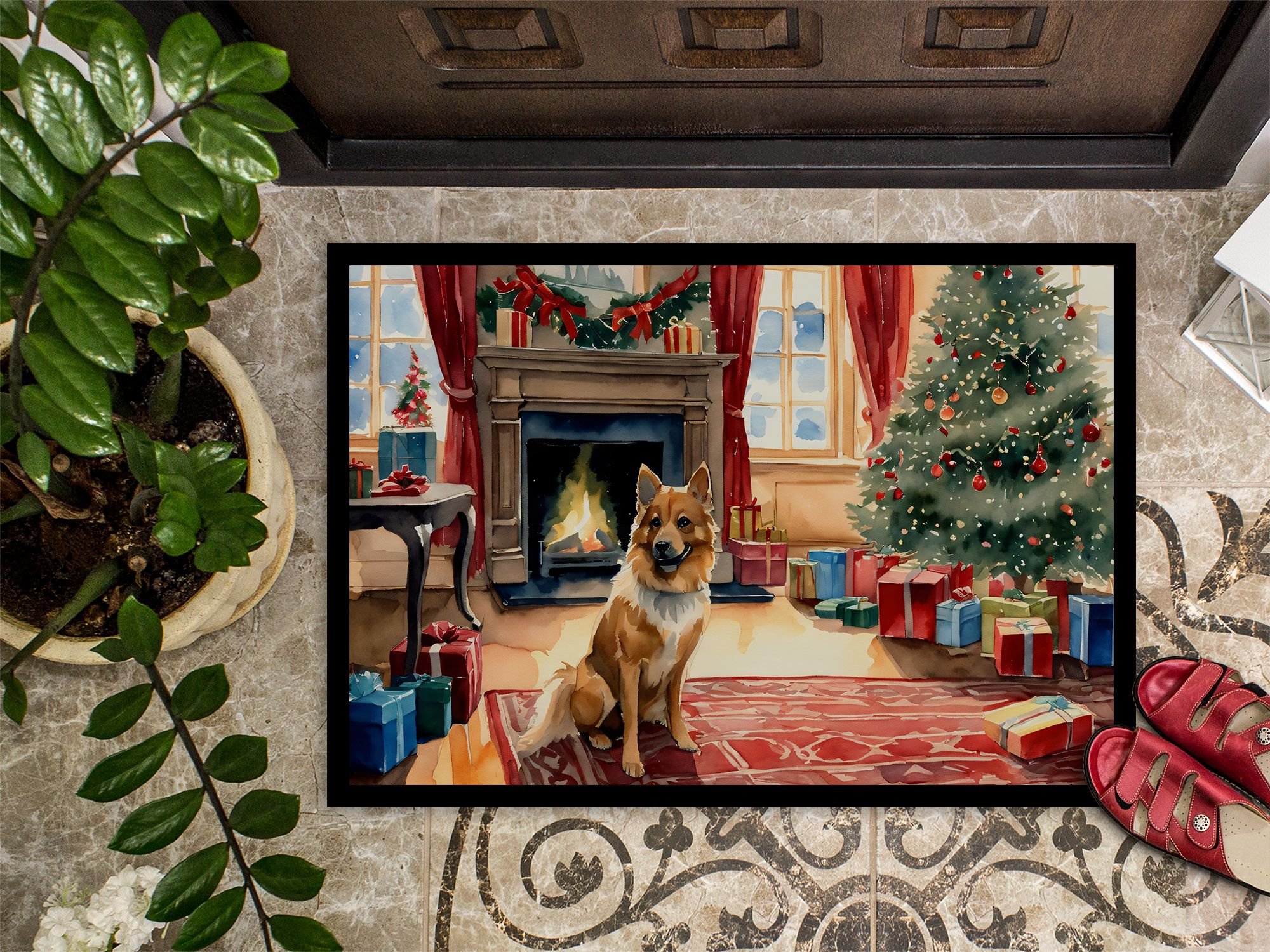 Doormat featuring breed specific Finnish Spitz artwork. Celebrate Christmas with this Christmas Doormat. Welcome your guests in style with our Artwork Door Mat, designed to withstand almost any weather condition. This mat, measuring approximately 24 by 36 inches, is held together by durable black binding tape. Its top layer, composed of polyester felt, is dyed with the eye-catching image you see on the mat. A few layers below provide the mat with stability, while its rubber bottom is stamped to help prevent slipping and ensures safety. Our mat works wonderfully as both an indoor or outdoor door mat. For cleaning, simply hose it off with water or use a power washer - no need for any cleaner that produces suds. Avoid scrubbing with a brush, instead, opt for the vacuum on floor setting. Designed manufactured and printed in the USA, this mat is a perfect addition to your porch, outdoor kitchen, entryway, or any indoor space. Its unique design makes it a charming decorative rug that greets your guests and adds a stylish touch to your home decor.
