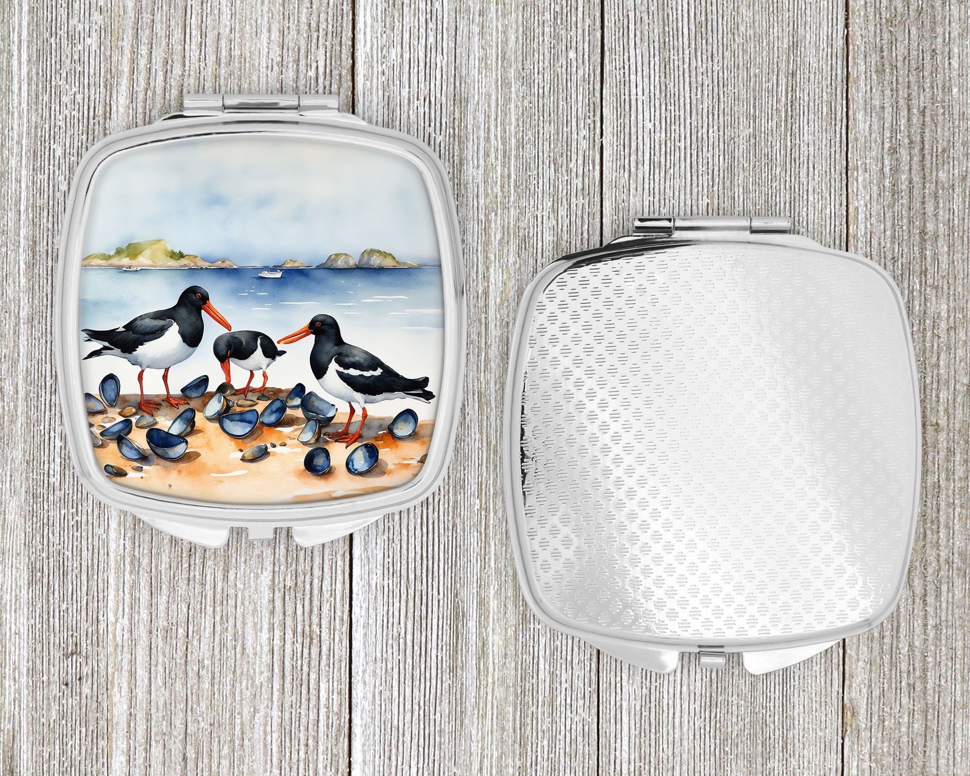 Compact Mirror featuring breed specific Oystercatchers artwork. Introducing our Square Compact Mirror, a blend of elegance, functionality, and compactness, perfect for on-the-go touch-ups. This Silvertone metal mirror, with dimensions of 2.75 inches x 3 inches x .3 inches, fits effortlessly into your purse, handbag, or pocket, ensuring that you can check your appearance anytime, anywhere. Our compact mirror stands out with its eye-catching artwork on the front, adding a dash of style to this practical accessory. It is more than just a mirror; it's a statement piece that reflects your personality and aesthetic. When opened, this compact reveals two mirrors inside, doubling your perspective for precise touch-ups. The Silvertone metal construction ensures durability while maintaining a lightweight feel, making it an ideal everyday carry item. Whether you're rushing to a meeting, prepping for a dinner date, or just need a quick check on your look, our Square Compact Mirror is your reliable companion. Experience the perfect blend of style and practicality with this must-have accessory.