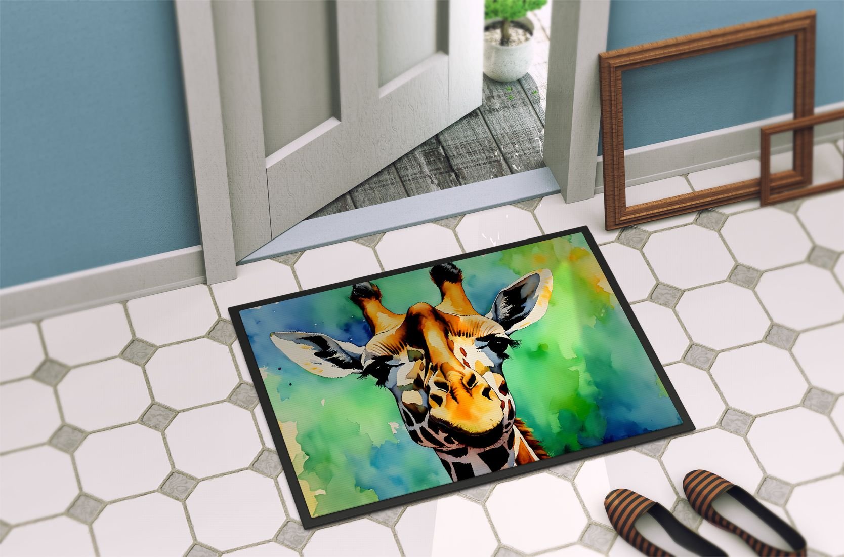 Doormat featuring breed specific Giraffe artwork. Welcome your guests in style with our Artwork Door Mat, designed to withstand almost any weather condition. This mat, measuring approximately 24 by 36 inches, is held together by durable black binding tape. Its top layer, composed of polyester felt, is dyed with the eye-catching image you see on the mat. A few layers below provide the mat with stability, while its rubber bottom is stamped to help prevent slipping and ensures safety. Our mat works wonderfully as both an indoor or outdoor door mat. For cleaning, simply hose it off with water or use a power washer - no need for any cleaner that produces suds. Avoid scrubbing with a brush, instead, opt for the vacuum on floor setting. Designed manufactured and printed in the USA, this mat is a perfect addition to your porch, outdoor kitchen, entryway, or any indoor space. Its unique design makes it a charming decorative rug that greets your guests and adds a stylish touch to your home decor.