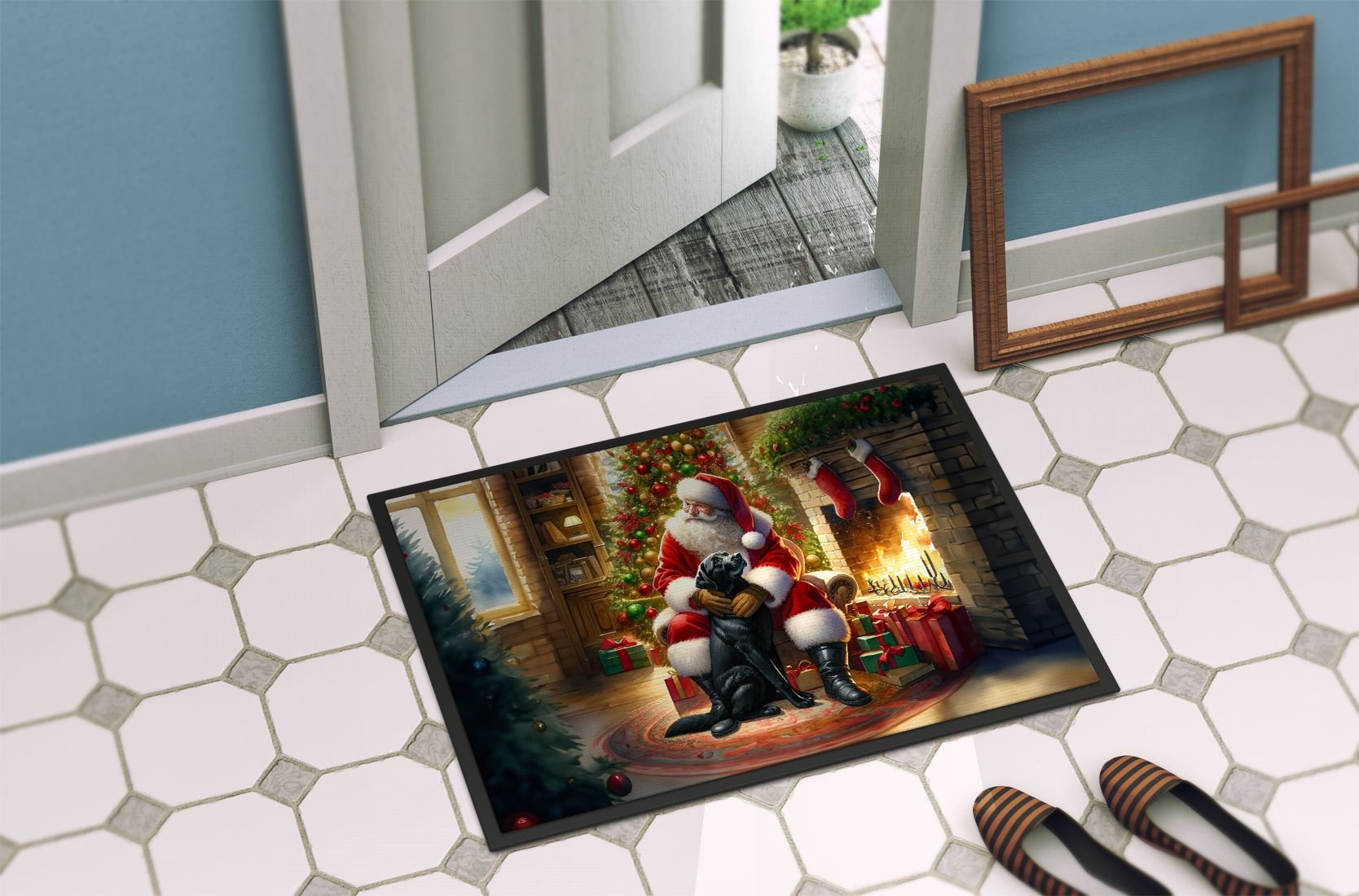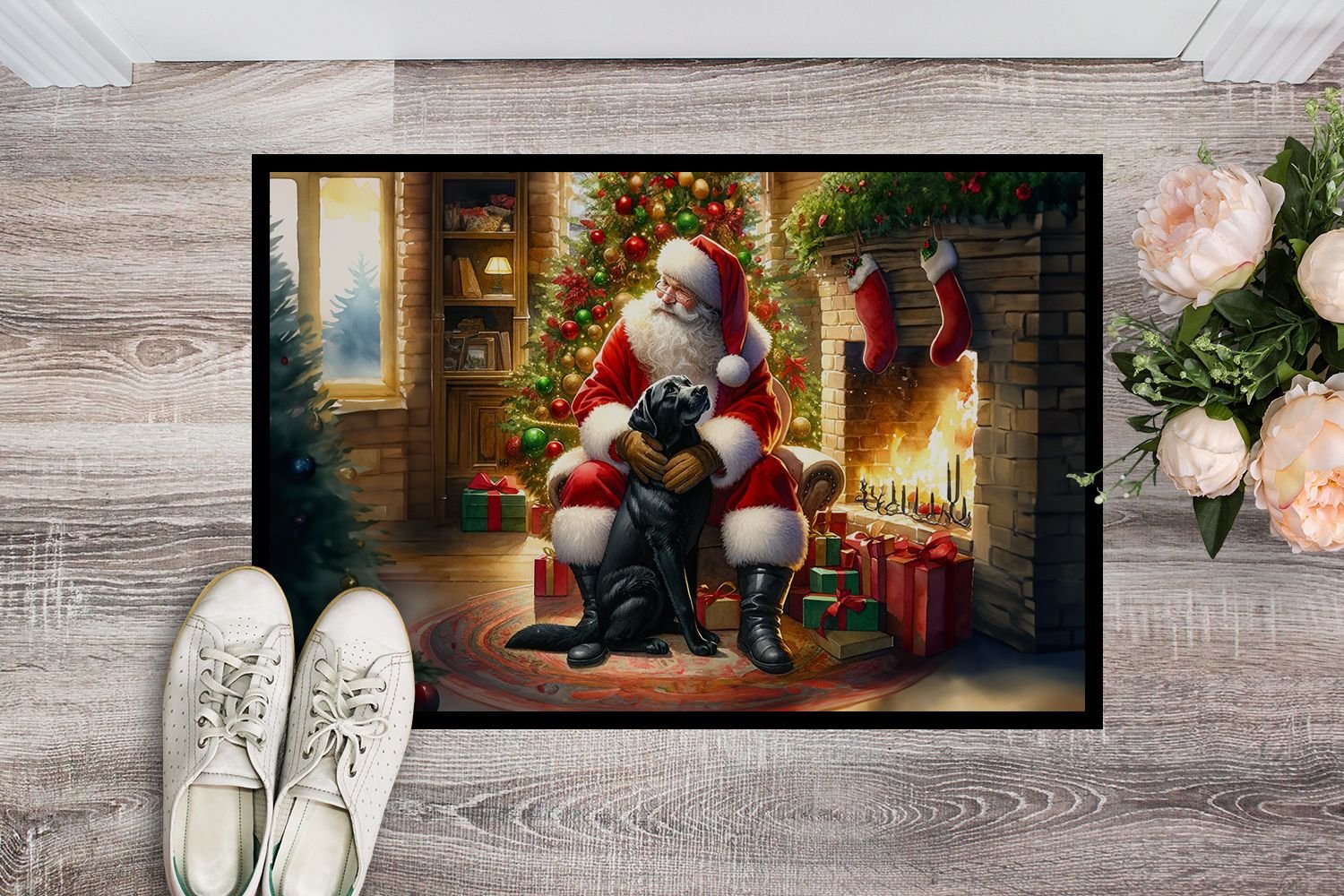 Doormat featuring breed specific Labrador Retriever artwork. Celebrate Christmas with this Christmas Doormat. Welcome your guests in style with our Artwork Door Mat, designed to withstand almost any weather condition. This mat, measuring approximately 24 by 36 inches, is held together by durable black binding tape. Its top layer, composed of polyester felt, is dyed with the eye-catching image you see on the mat. A few layers below provide the mat with stability, while its rubber bottom is stamped to help prevent slipping and ensures safety. Our mat works wonderfully as both an indoor or outdoor door mat. For cleaning, simply hose it off with water or use a power washer - no need for any cleaner that produces suds. Avoid scrubbing with a brush, instead, opt for the vacuum on floor setting. Designed manufactured and printed in the USA, this mat is a perfect addition to your porch, outdoor kitchen, entryway, or any indoor space. Its unique design makes it a charming decorative rug that greets your guests and adds a stylish touch to your home decor.