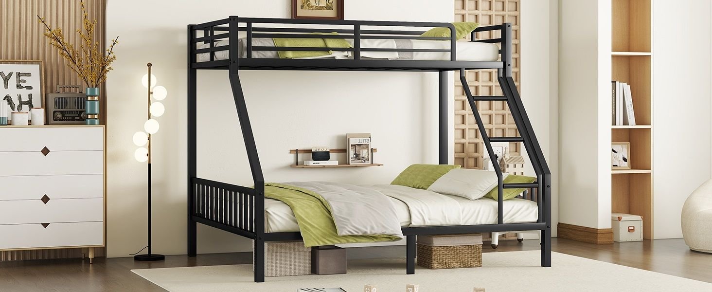 [Space-Saving Metal Bunk Bed Design]: This space-saving twin XL over queen metal bunk bed meets all your needs and expectations. Features easy access guardrails, build-in ladder and thick metal tube support slat system. Accommodating a XL twin and Queen mattress, this sturdy metal bunk bed will last through years of play.