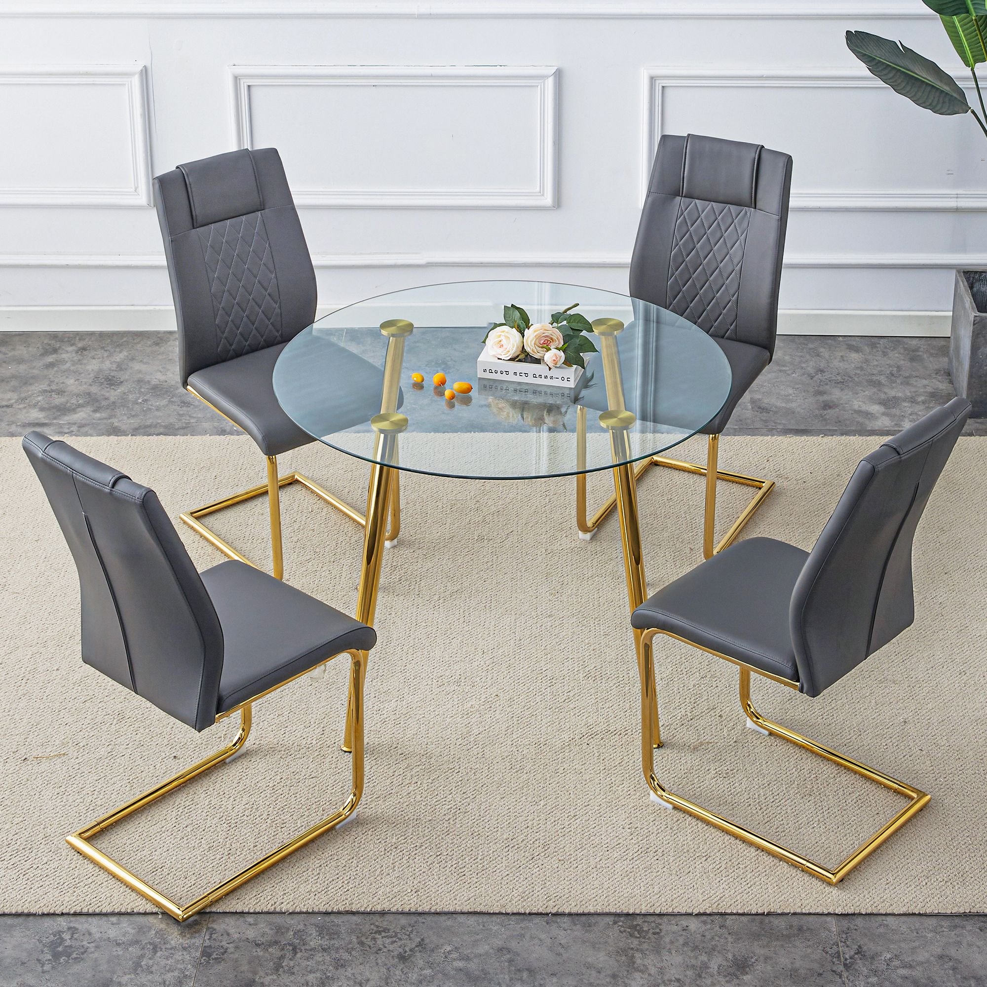 Table and chair set, circular dining table, glass tabletop with a diameter of 40 inches and gold-plated metal legs