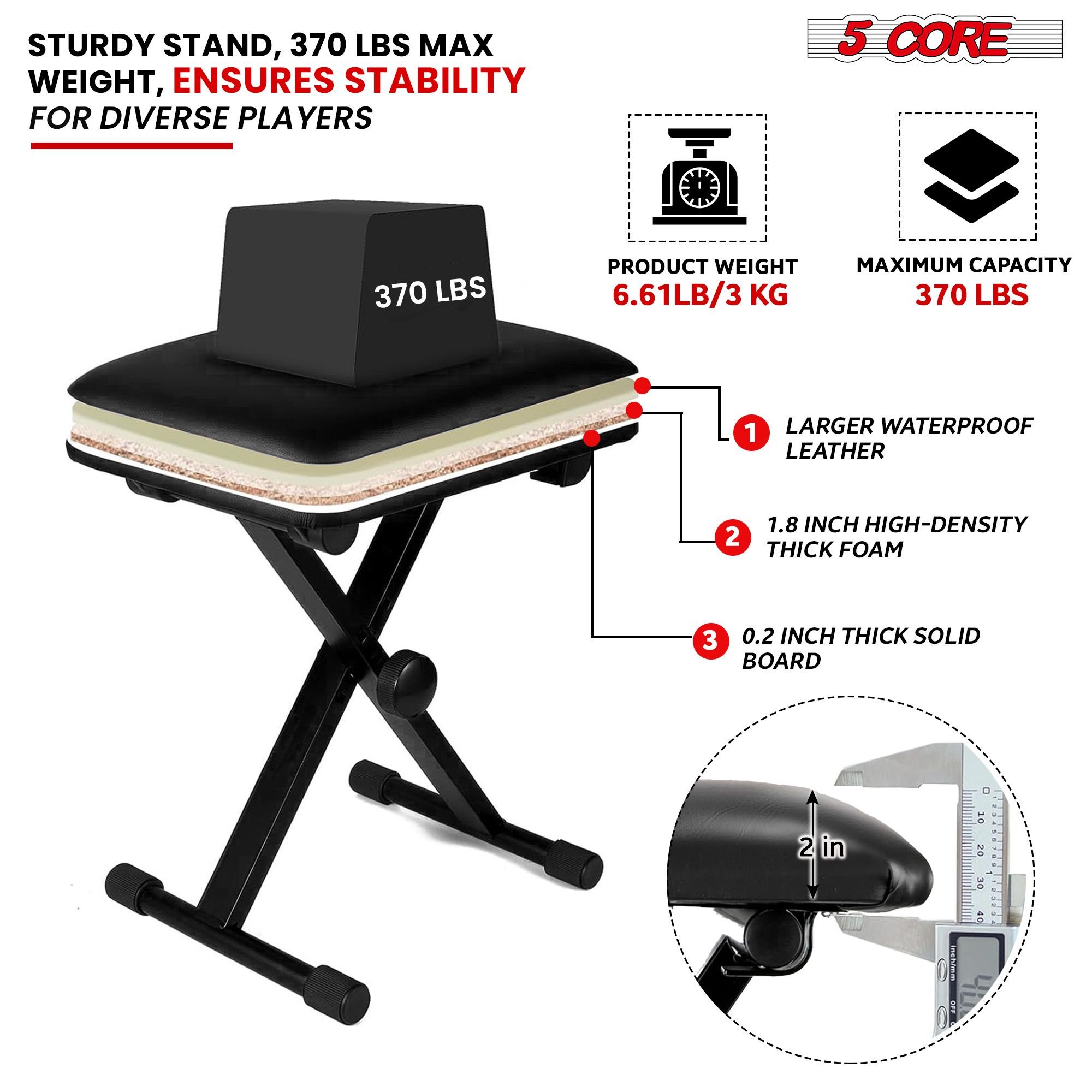 Experience ultimate comfort with our key board bench, featuring 2 inch thick sponge padding. Easily adjust the height from 12 to 18.5 inches to suit any player. Constructed with heavy duty metal alloy and reinforced joints, this piano stool ensures durability. Anti slip rubber pads ensure stability, even during intense performances. Its foldable design makes transport and storage effortless. The premium seat cover, made from breathable materials, enhances comfort. With superior stability and exceptional build quality, our piano stool is perfect for every musician. The 4 hole adjustment mechanism allows for quick height changes, ensuring the ideal playing position. |