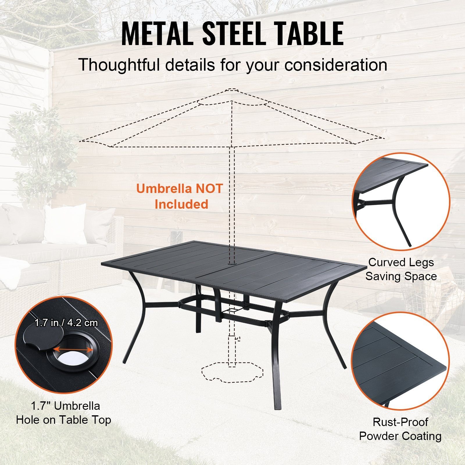 4.Metal Steel Table: The patio table features a 1.7" umbrella hole on the tabletop, allowing you to create shade on hot days and add your favorite umbrella for a touch of personalization. The curved legs save space, and a rust-proof powder coating for durability, even when exposed to the elements.