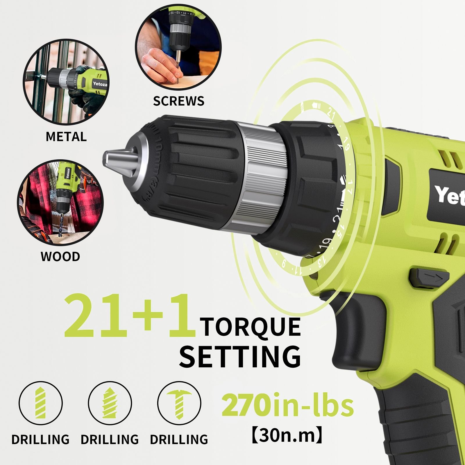 2.21+1 Position Clutch: 21+1 torque settings power drill can provide more precise torque or speed adjustment as required, which helps to prevent sinking a screw too deep, stripping out the head of a screw or even breaking a screw shaft.