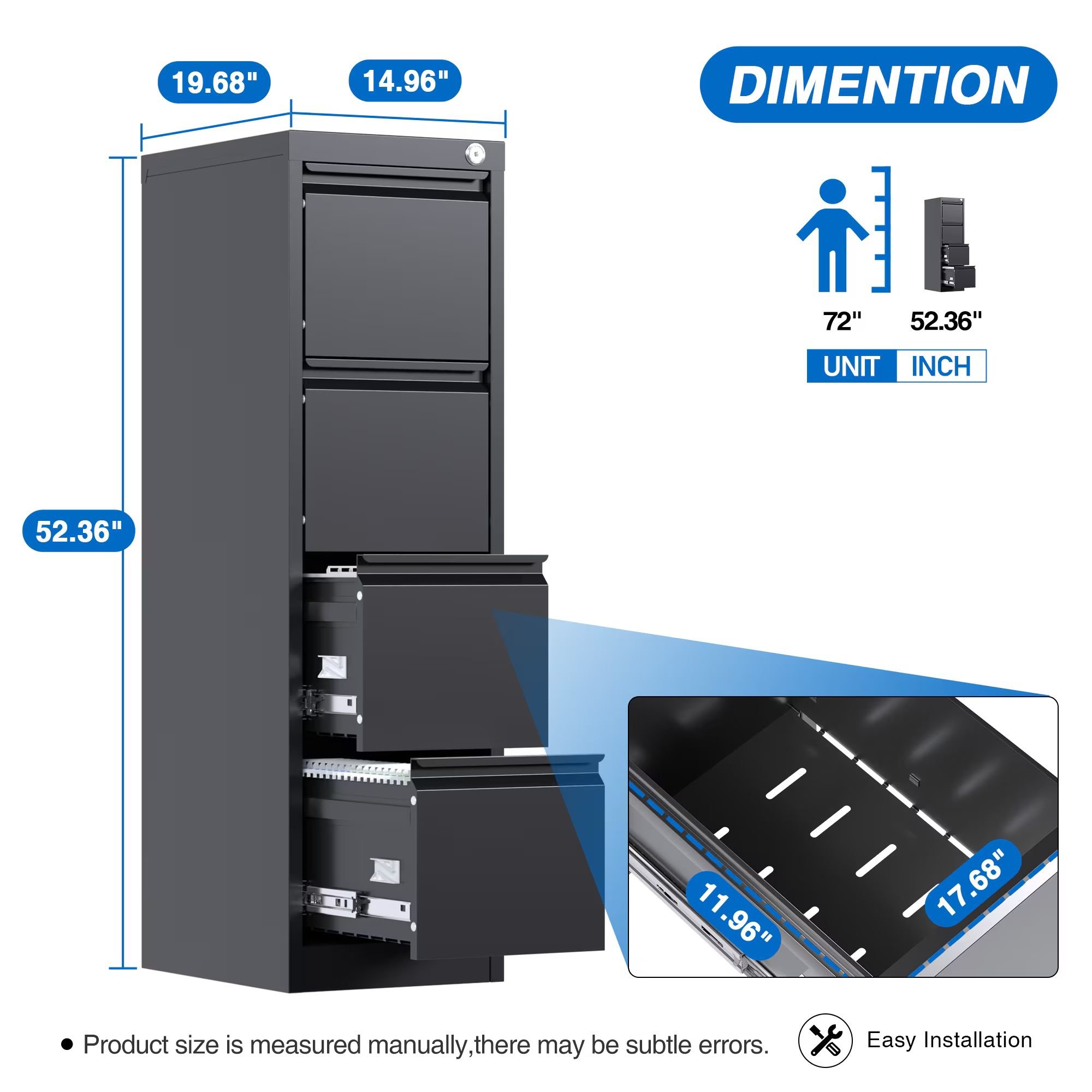• [Larger and Deeper Drawers]The 4 drawer file cabinet is larger and deeper than similar ones, each drawer fits practically anywhere for up to 100 hanging folders. Each drawers also equipped with 1 adjustable hanging rails , which can perfectly store letters, legal, A4 or F4 size folders to meet your different needs.