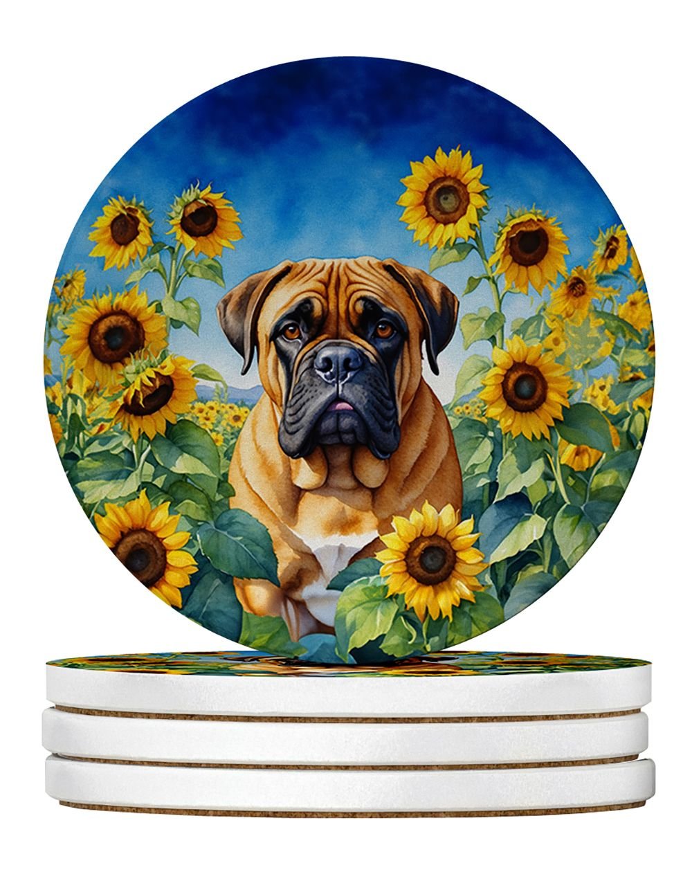 Home > Bullmastiff in Sunflowers Large Sandstone Coasters Pack of 4 Absorbent Round Coasters Decor Gifts for Men or Women, 4 in, Multicolor