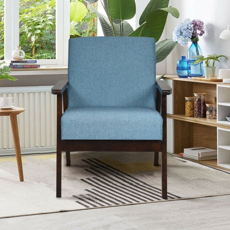 Retro Linen Wide Accent Chair with Espresso Rubber Wood Frame – Blue
